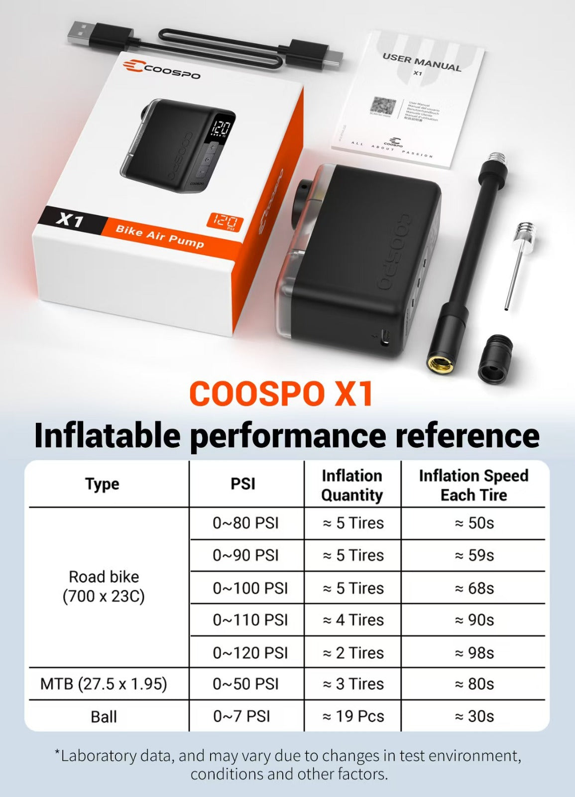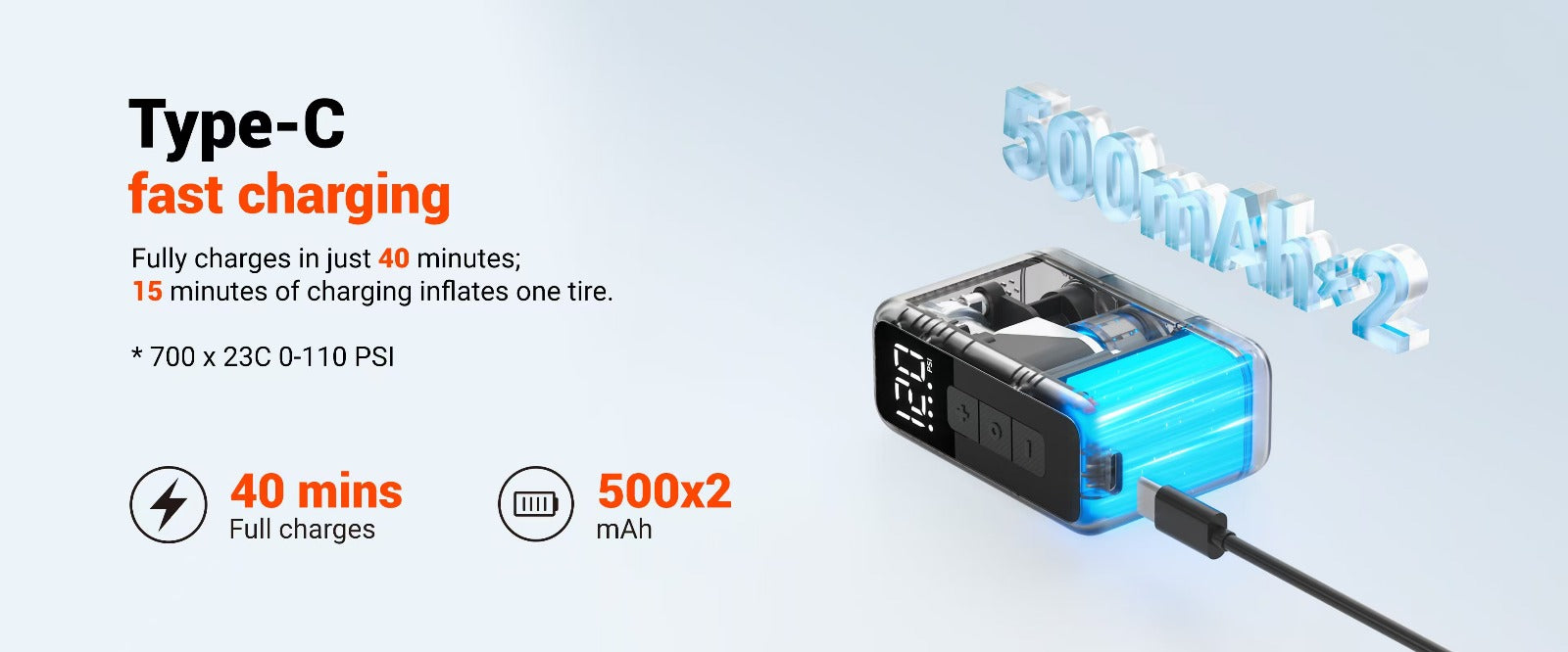 - Capacité : capable de gonfler 4 pneus à 7.6 bars (110 PSI) en une seule recharge.